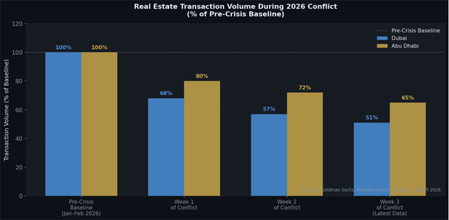 However, the rosy picture of 2025 has collided with a complex geopolitical reality in March 2026. Recent reports, including data from Goldman Sachs, indicate that real estate transaction volumes across the UAE dropped by approximately 37% year-on-year during the first few weeks of the conflict. This on-the-ground decline is real and palpable, proving that even the strongest markets are not immune to temporary shocks in investor confidence.