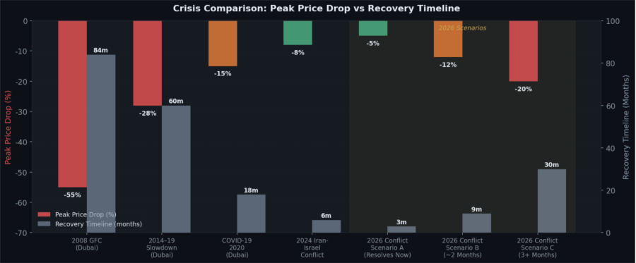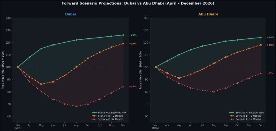 Scenario A: Near-Term Stabilization (Slow Recovery) Even if geopolitical tensions resolve shortly, investor confidence does not return overnight. It will take three to six months for transaction volumes to normalize. Under this scenario, Abu Dhabi prices will stabilize with only marginal growth by year-end, driven primarily by end-users and steady domestic demand.
